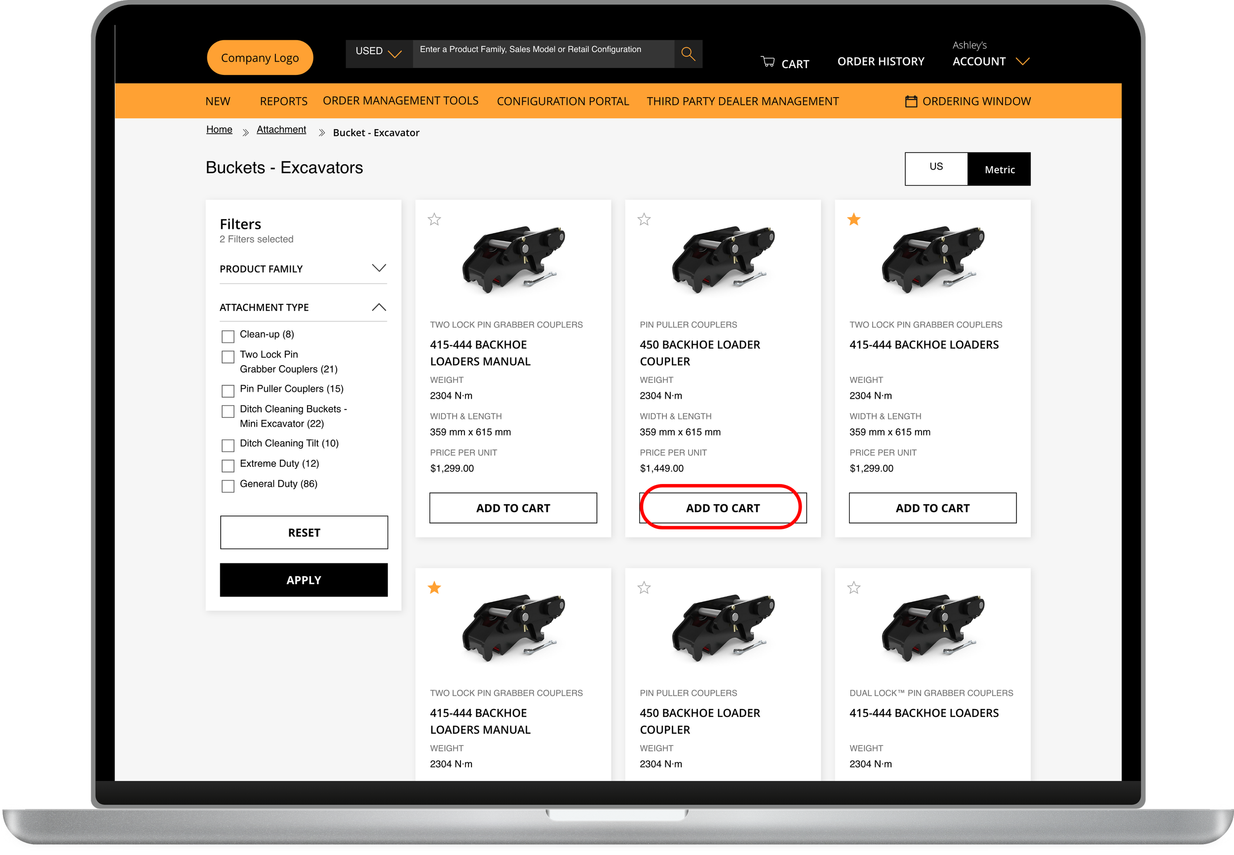 Making the process of inquiring and ordering attachments for the dealers easy and independent. To achieve this, we need to add a new section to the existing e-commerce platform that focuses solely on attachments. It includes vital information such as the list of attachments available, the specifications, price, and machine compatibility.