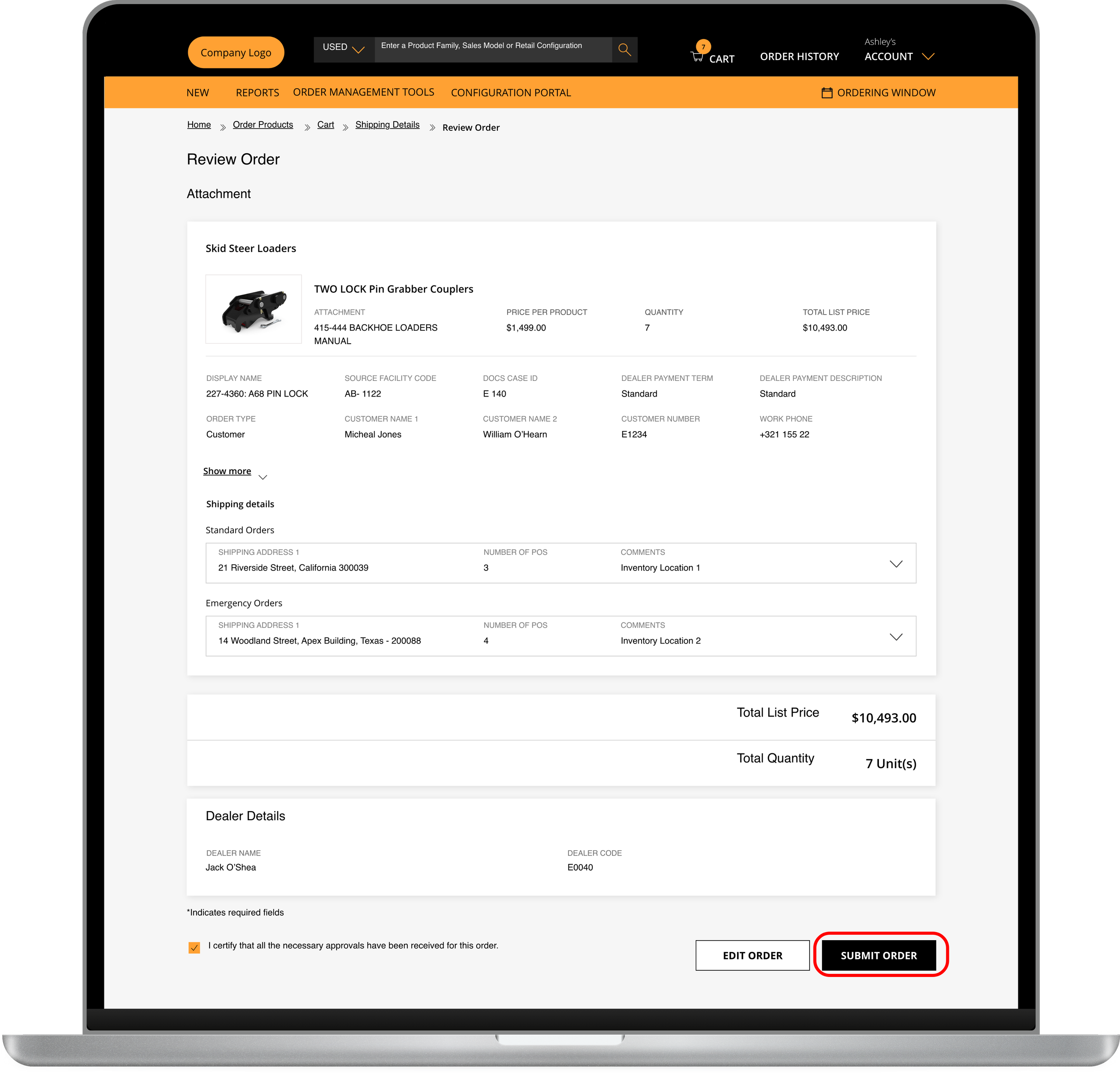 All Order information at once! - The Dealer can view all the order information here and select “Submit Order” if everything is in accordance