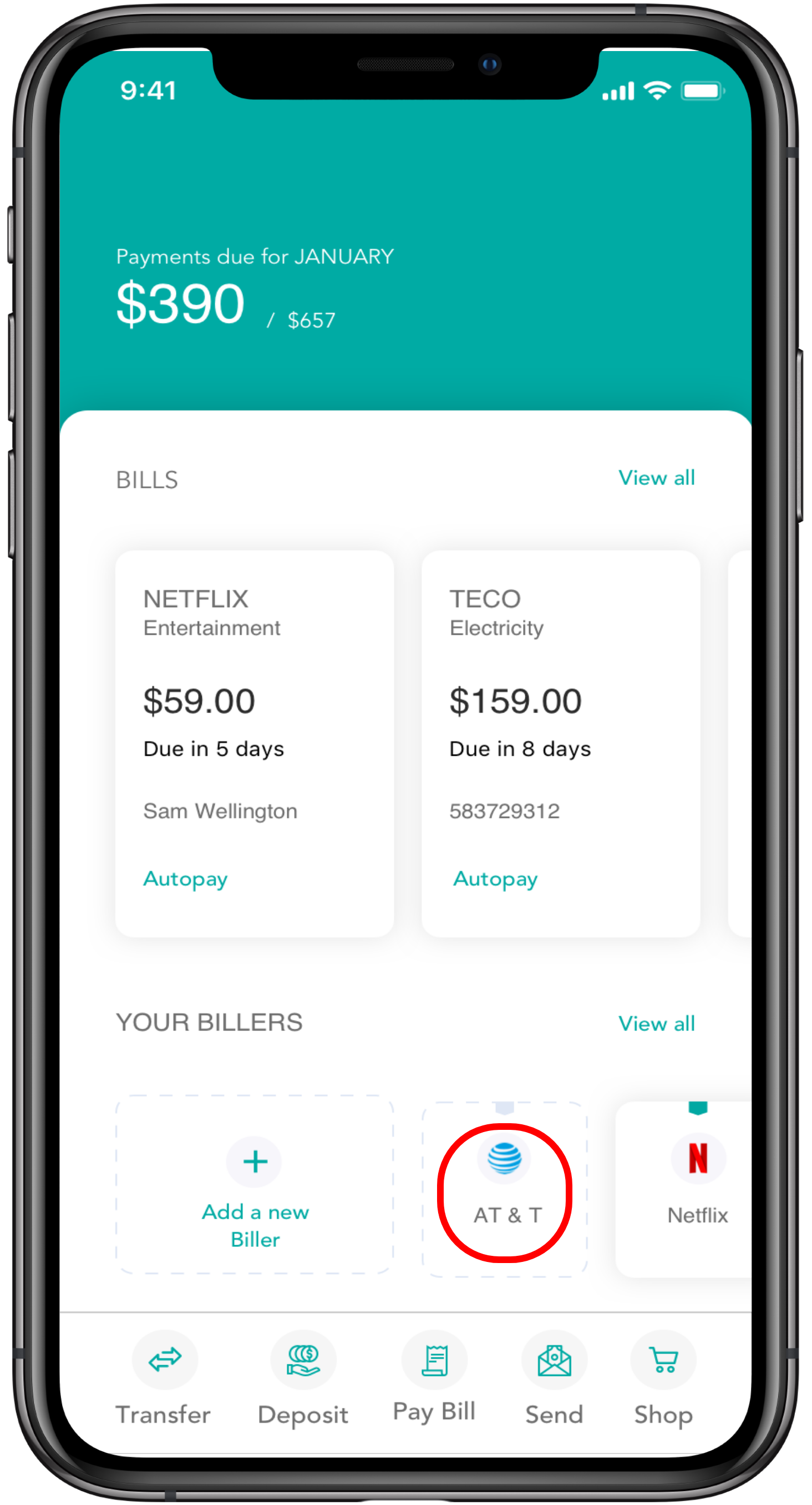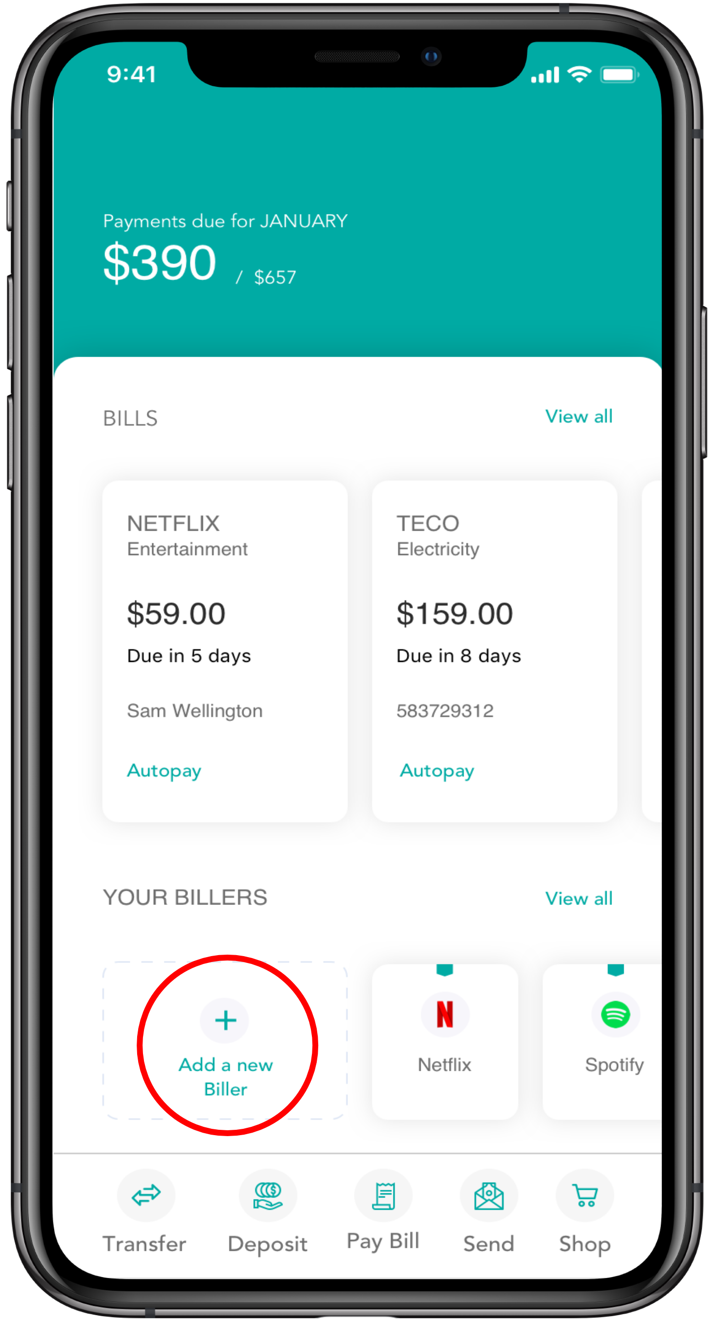 • Access adding a new biller and viewing their most recently paid billers