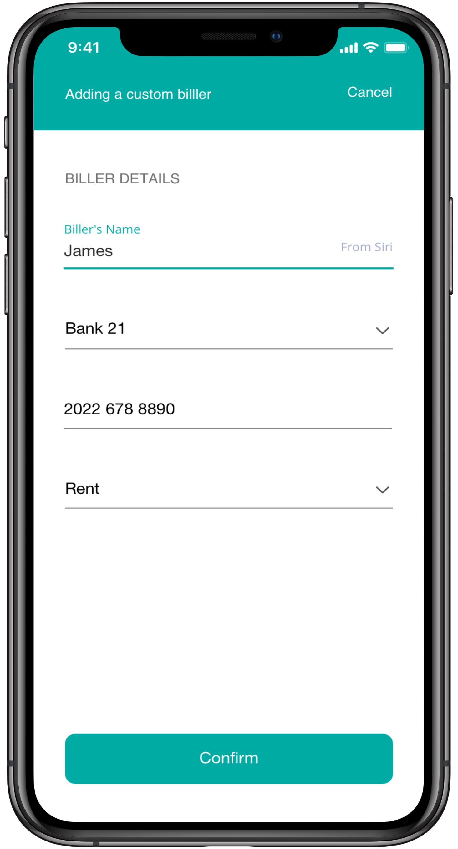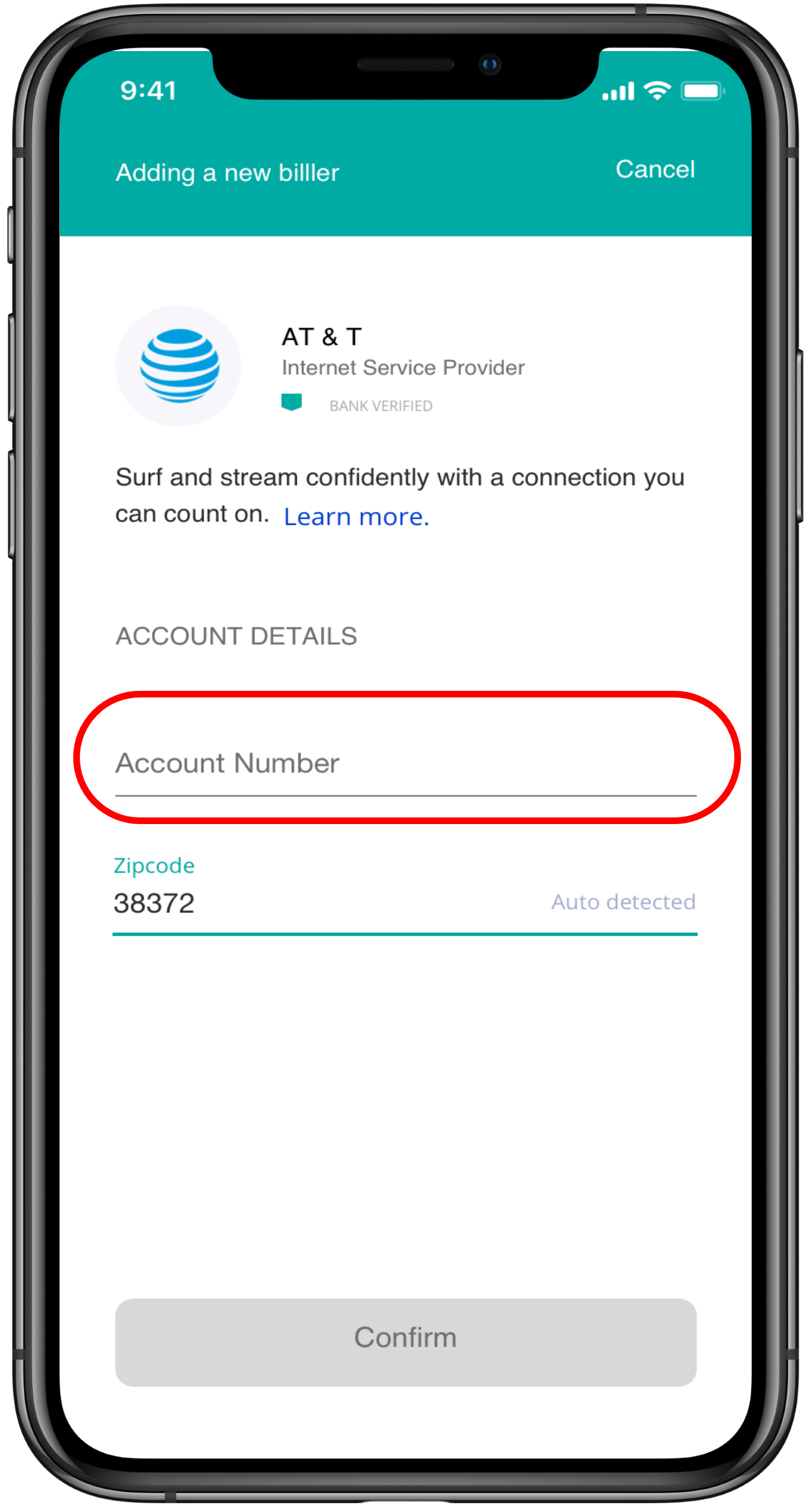 After adding your account number, tap “Confirm”, and the app starts processing adding the new biller